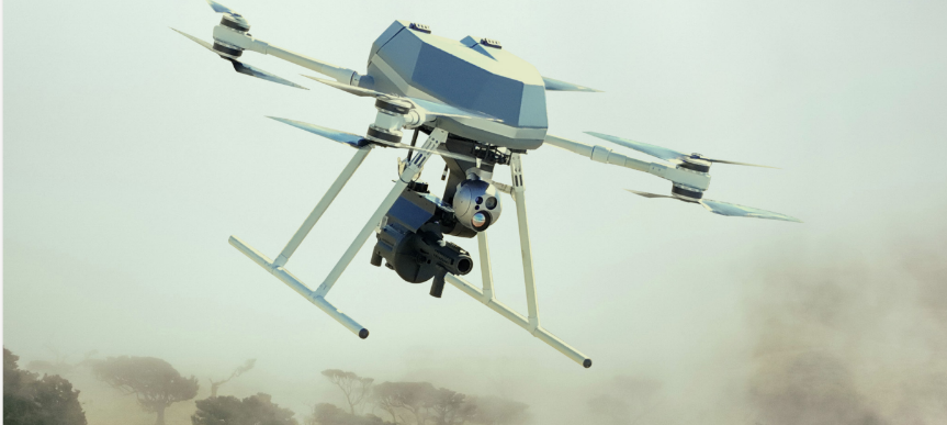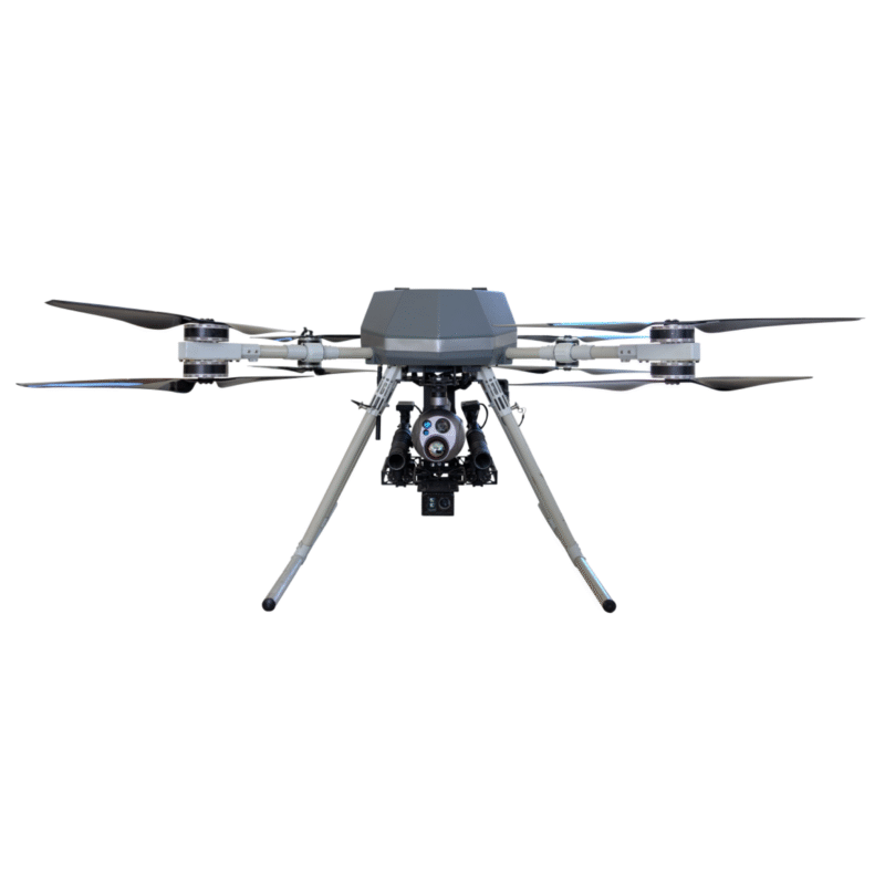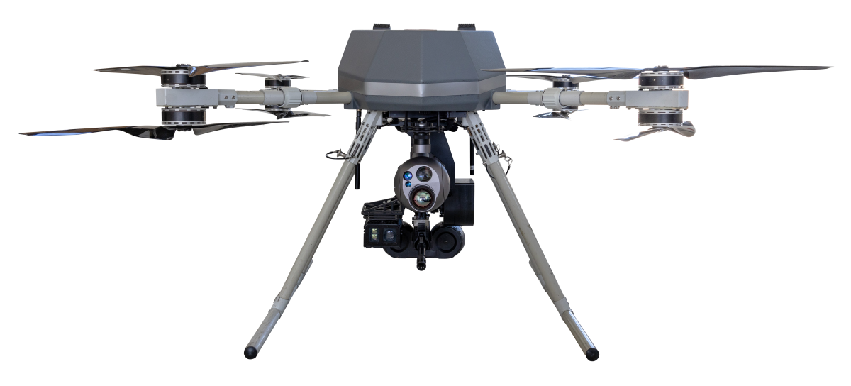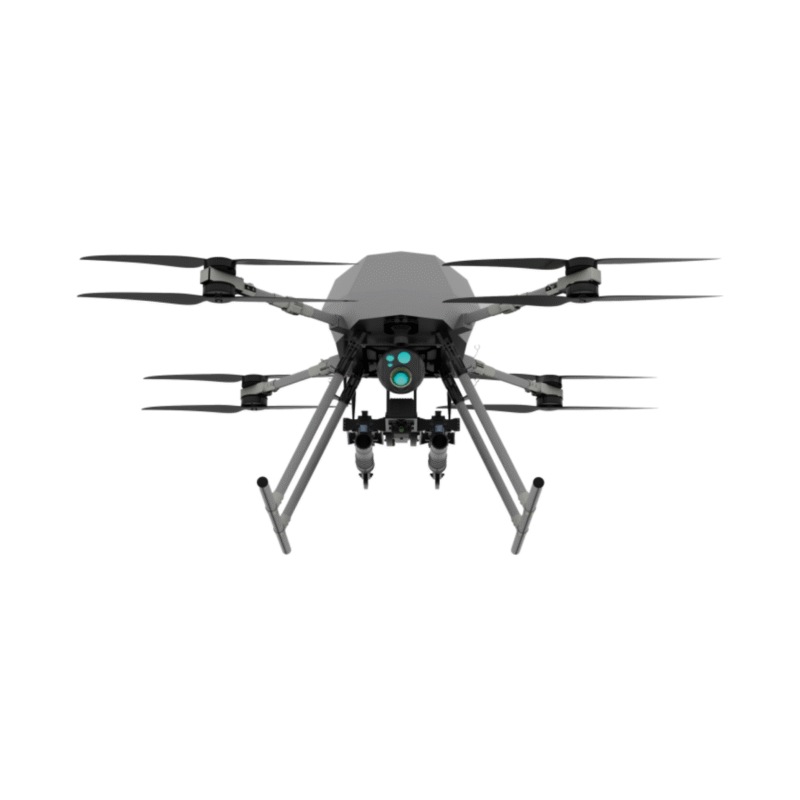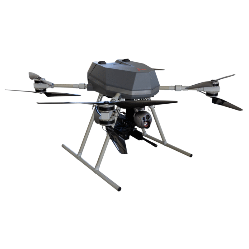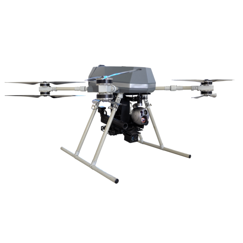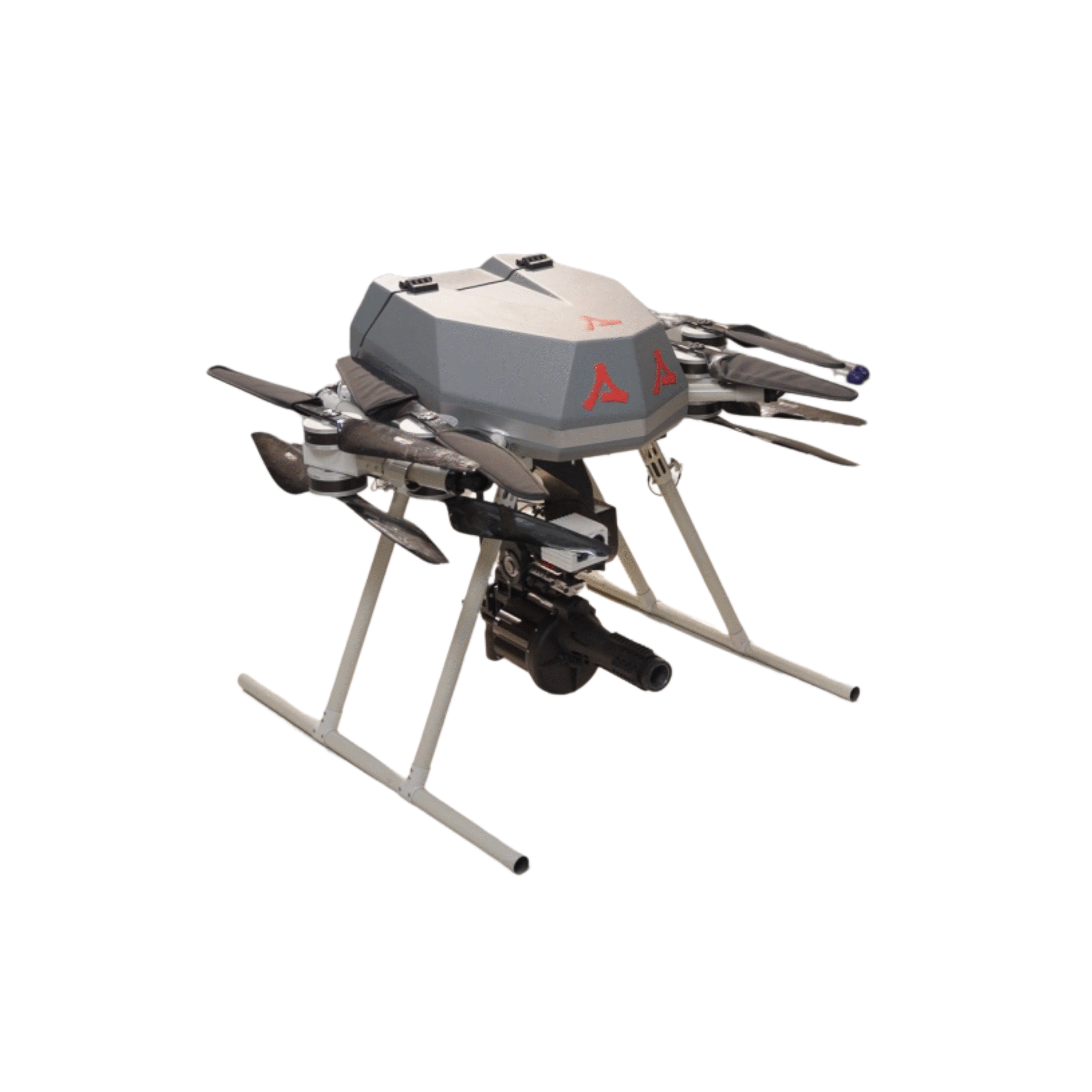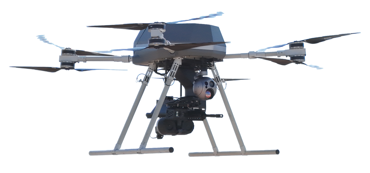SONGAR® 6×40 mm Grenade Launcher Drone – Armed UAS with six-round drum launcher for high-volume aerial firepower. Fires up to 6 grenades at 400–450 m range with stabilized targeting, +5° to –90° elevation, and multi-layered firing safety. 35-minute endurance (no payload).
